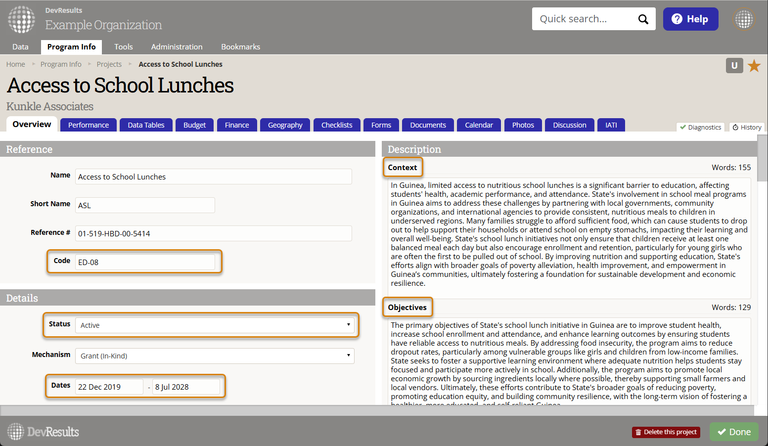 Typically, one project record in DevResults corresponds to one IATI activity. This page describes how to fill in the necessary project fields in DevResults to populate the IATI activity file.