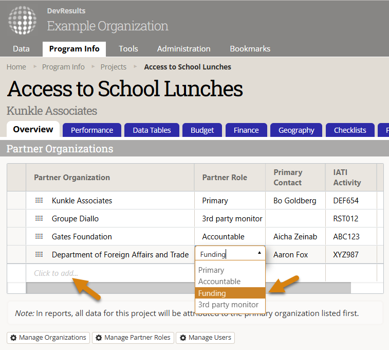 - Partner Organization - Partner Role: IATI requires that at least one partner organization is associated with the project/activity and that all partner organizations have a designated organization role. [Required]