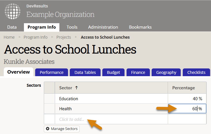 - Sector: Sectors in DevResults are mapped to an IATI sector vocabulary list — typically OECD DAC CRS Purpose Codes (5 digits) — so that you can refer to these codes with everyday terms. One or more sectors can be associated with each project/activity. If more than one sector is applicable, you must provide the percentage value for the portion of the budget allocated to each sector. The percentages must add up to 100. See IATI's description of sectors for more information. [Optional]