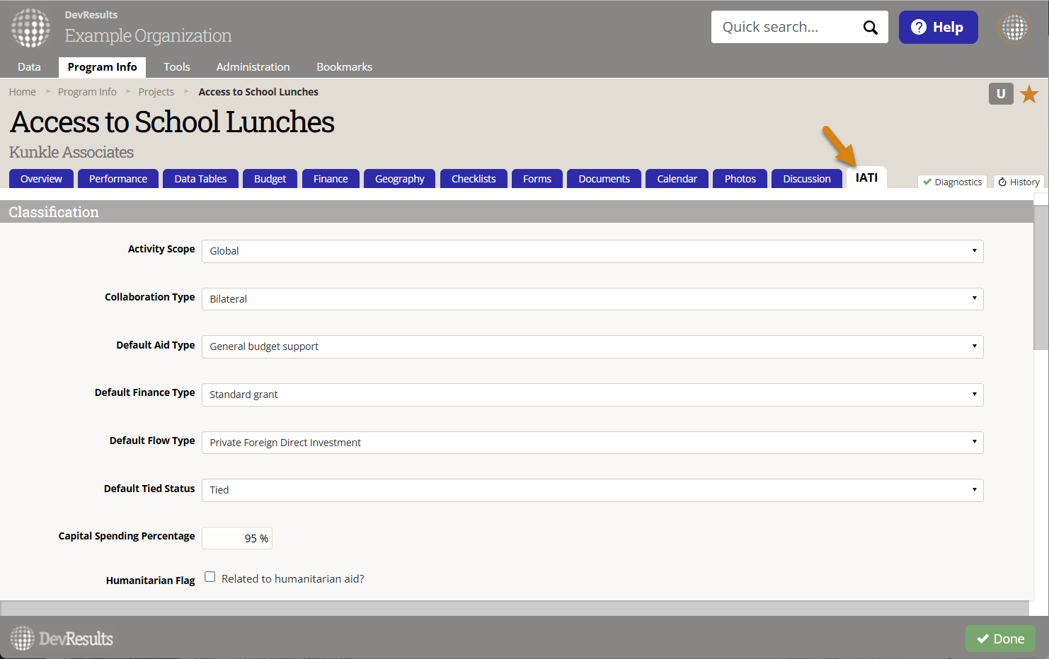Additional information about each project can be included in the IATI activity export. From any project page, click on the IATI tab. (If you don't see the IATI tab, you need to enable it under Administration > Program Settings.)