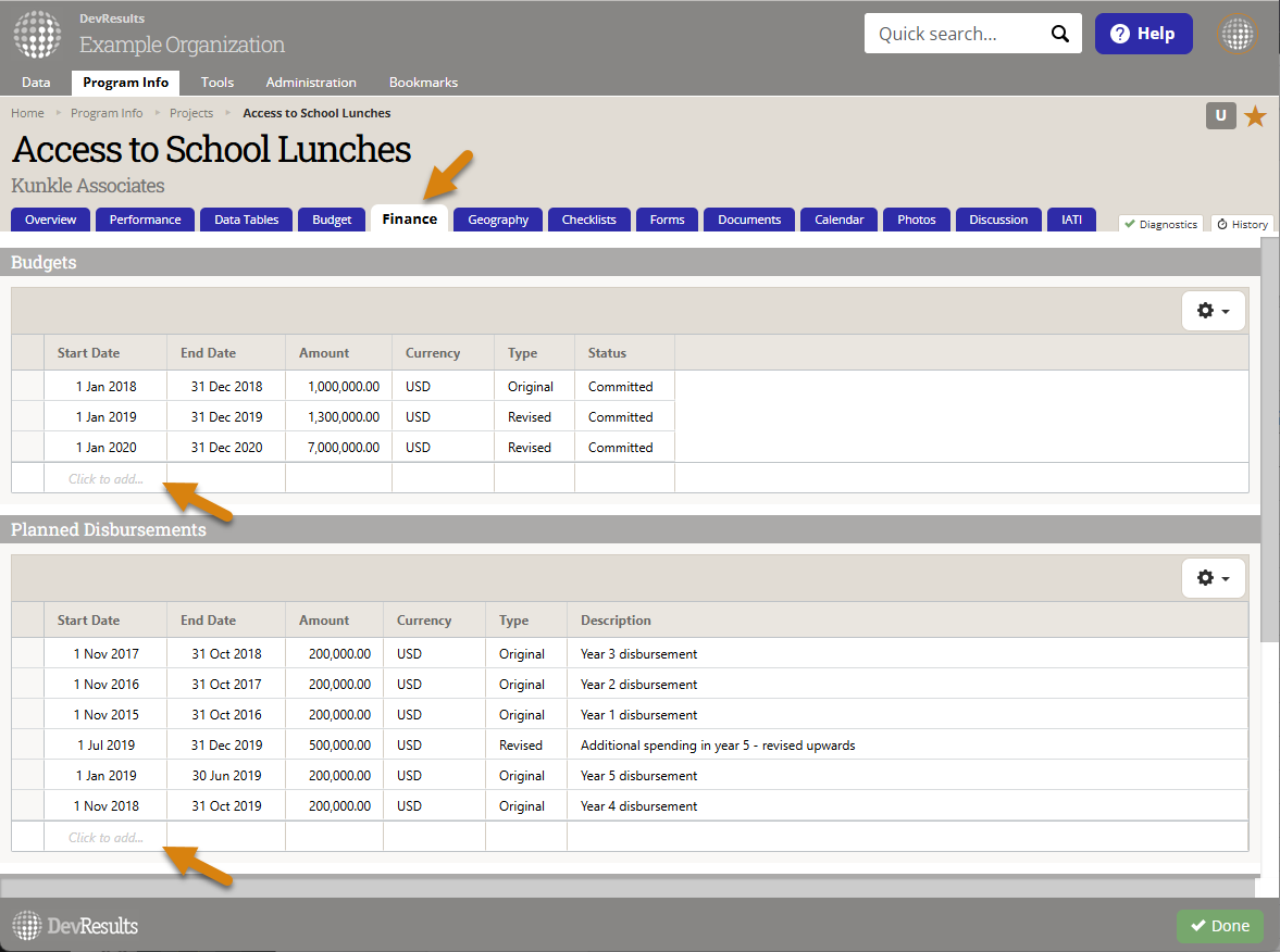 Financial information about each project can be included in the IATI activity export. From any project page, click on the Finance tab. (If you don't see the Finance tab, you need to enable it under Administration > Program Settings.)