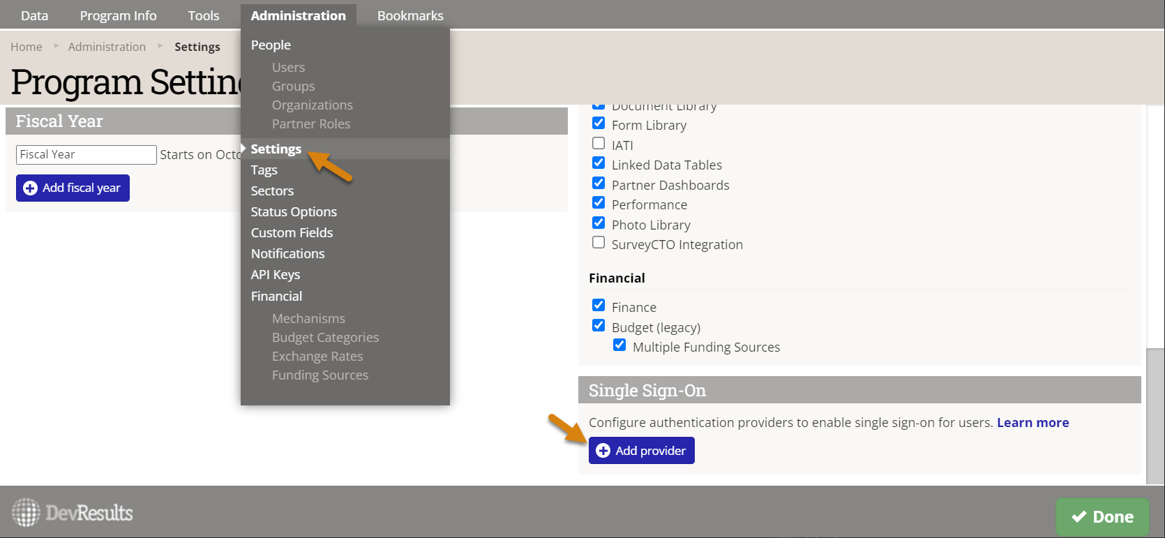 4. In DevResults, go to Administration > Settings. In the Single Sign-On section, click the Add provider button.