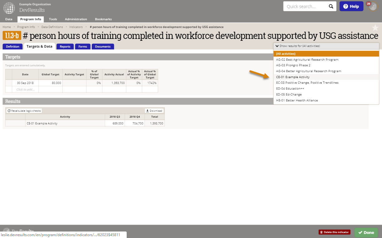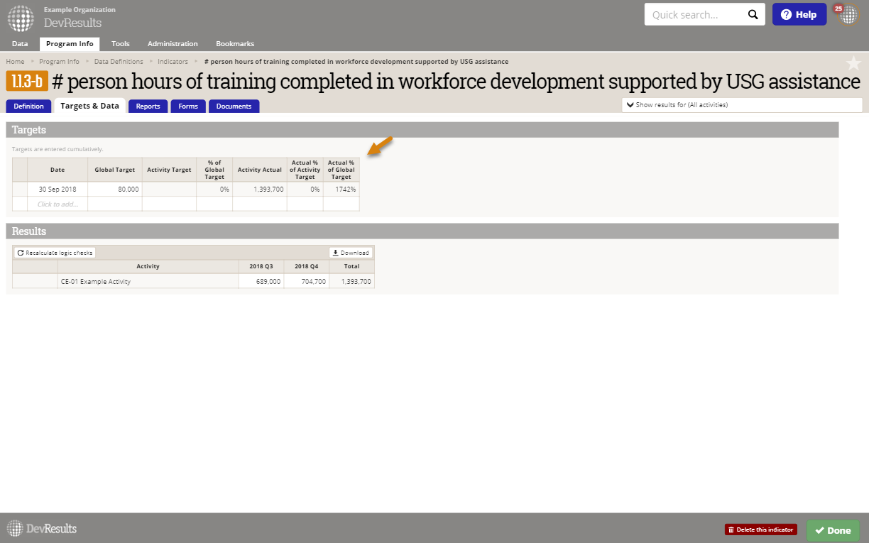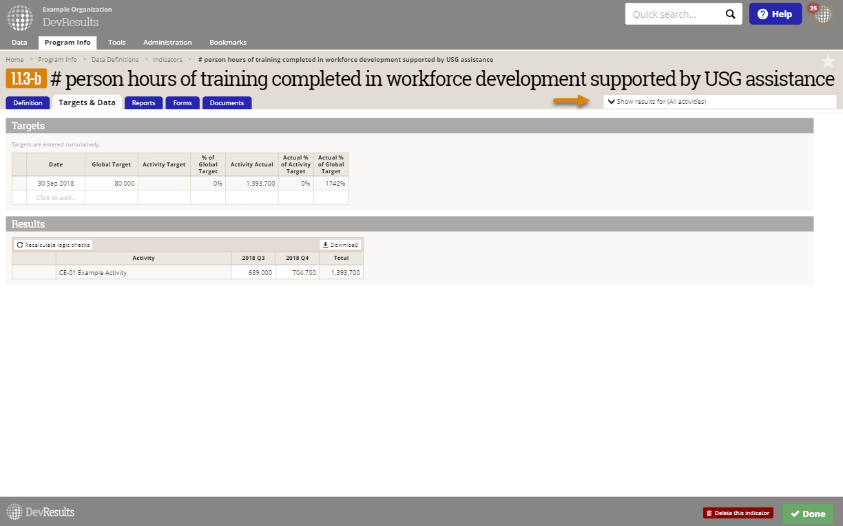 DevResults enables users to set targets for indicator results. Targets define goals per indicator, per reporting period, and (optionally) per project. When targets are entered in DevResults, the system automatically includes progress-to-target analyses and visualizations.