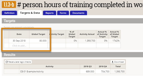 For example, the global target for an indicator this quarter might be 100. This means that the whole organization's goal is to achieve a result of 100 this quarter. If two projects report on the same indicator, perhaps one project's target is 40 and the other project's target is 60.