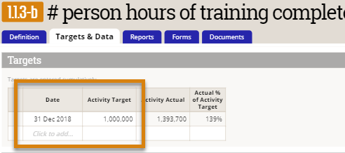 - Project targets are goals for indicators for that project. (To enable project targets, indicators must be defined as "Results are reported separately for each project" and assigned to one or more projects.)